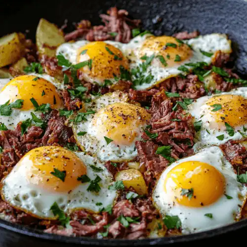 Corned beef hash recipe with crispy potatoes and eggs in a cast-iron skillet