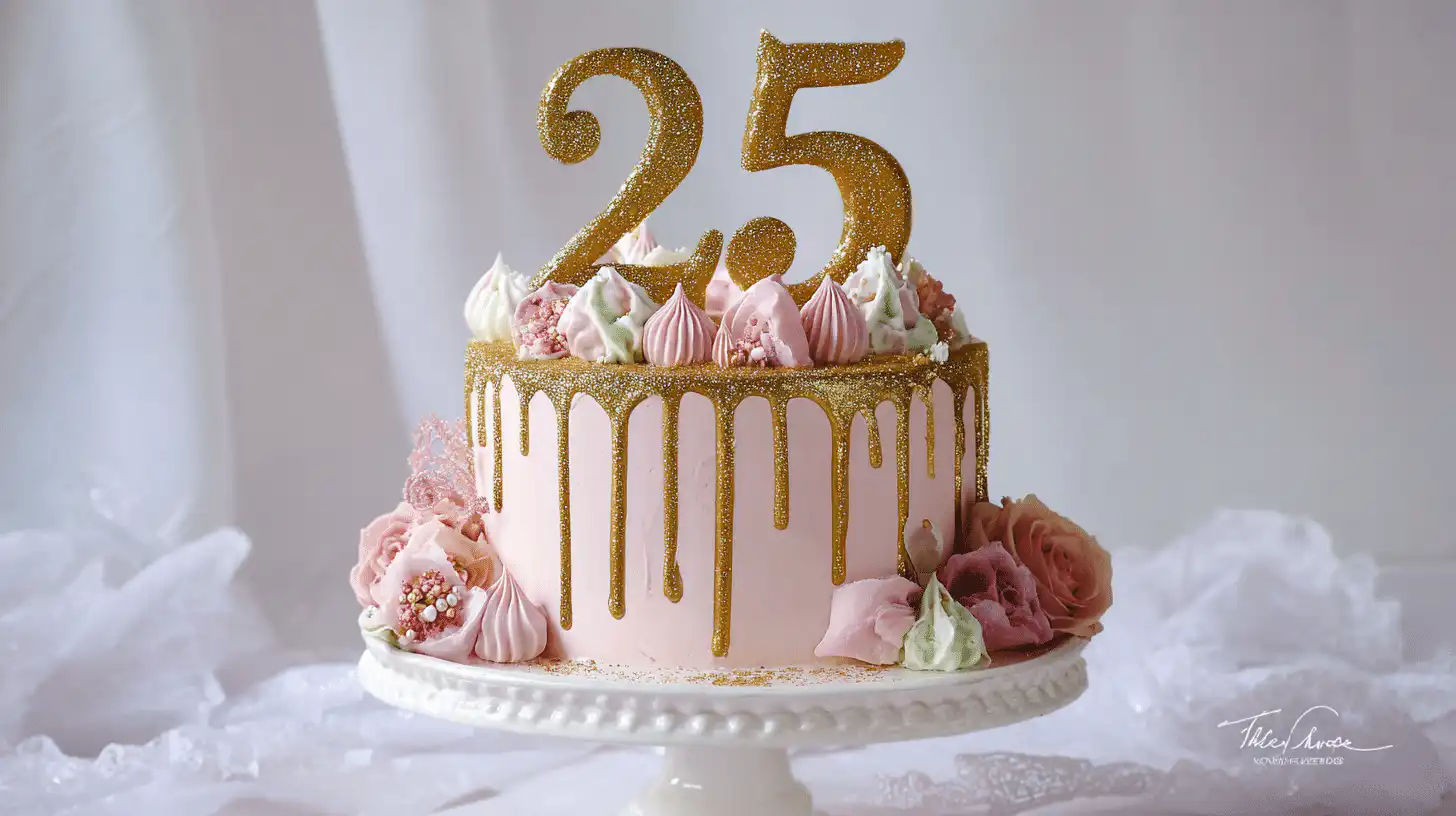 Use dried flowers, gold leaf, or pastel frosting — perfect for an aesthetic 25th birthday cake look.